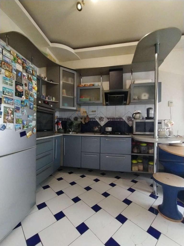 Потолки высотой 3,50. В большой комнате ещё осталась лепнина на потолке. В остальных комнатах натяжные потолки. На кухне двухуровневый потолок. Высокие окна: стеклопакет, рамы пластиковые. Пол деревянный, частично паркет, линолеум, плитка. Отопление и горячая вода от двухконтурного котла. Есть кондиционер.
